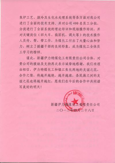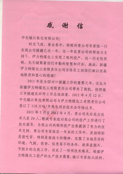 新疆伊力特煤化工有限责任公司致我公司的感谢信