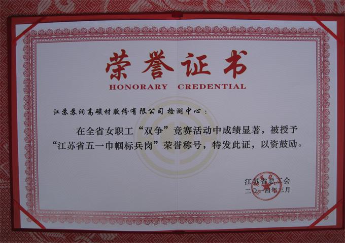 我公司检测中心获“江苏省五一巾帼标兵岗”荣誉称号